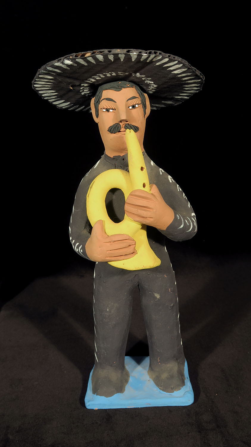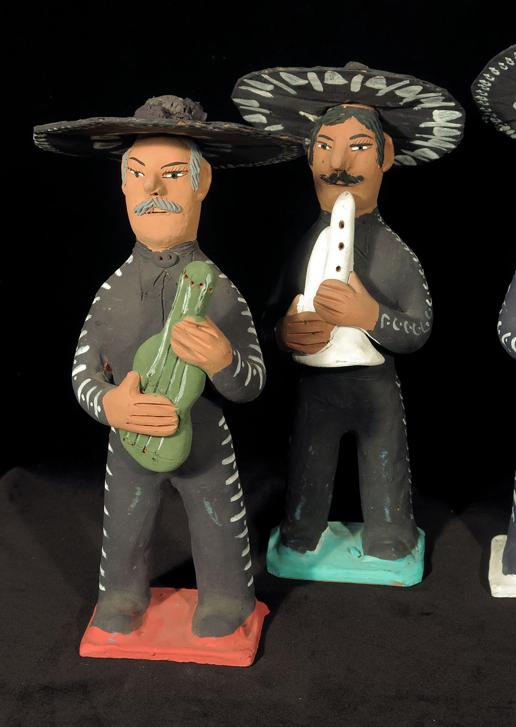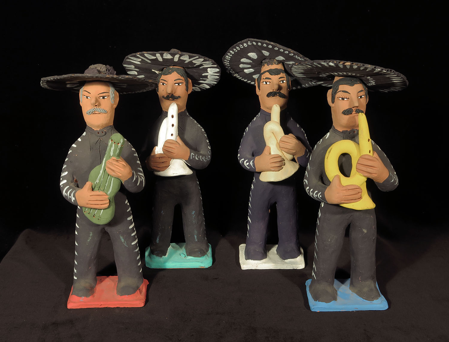 Set of four fired clay figures painted with acrylic paints. Removable sombreros made of corrugated cardboard, painted.
