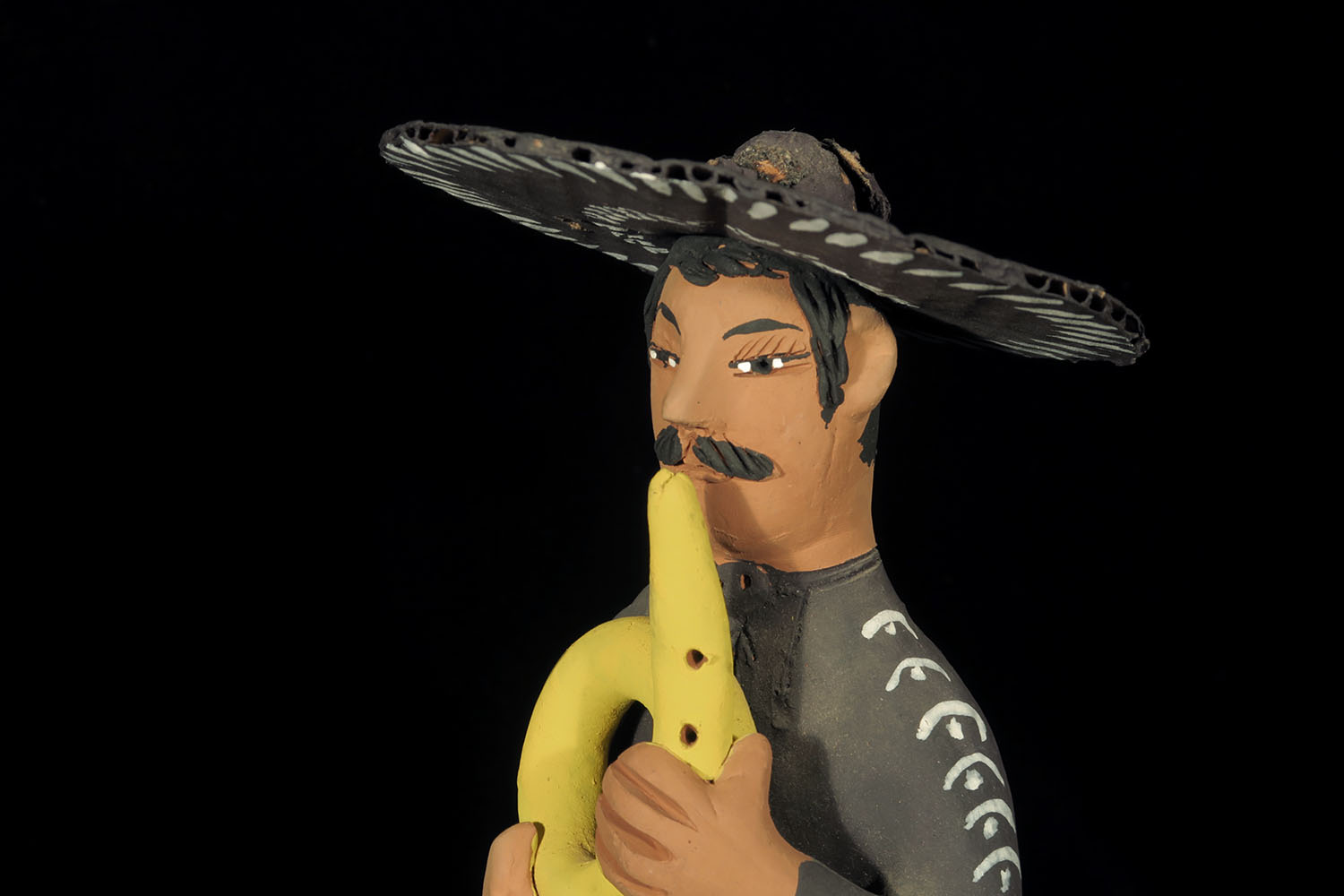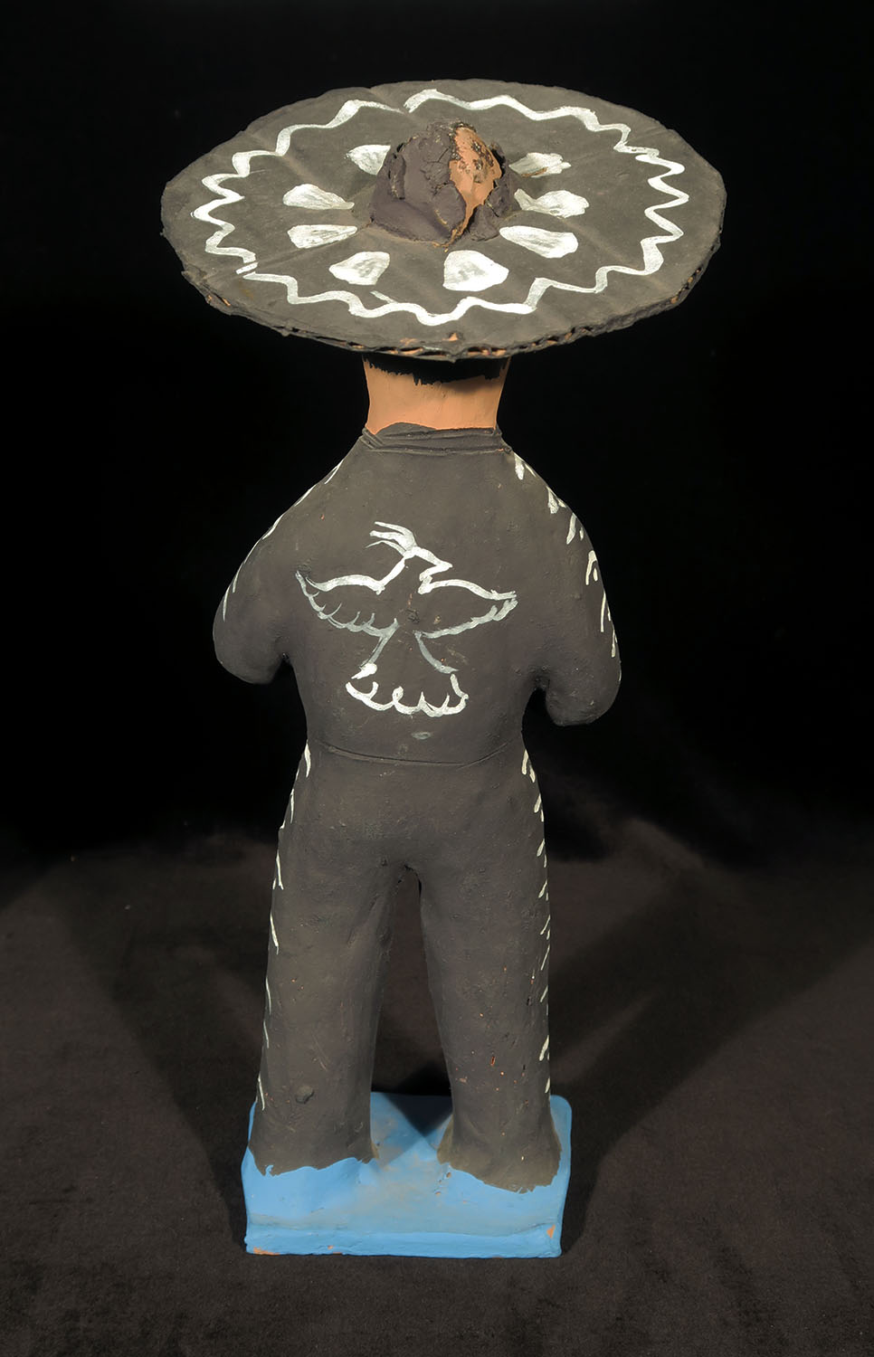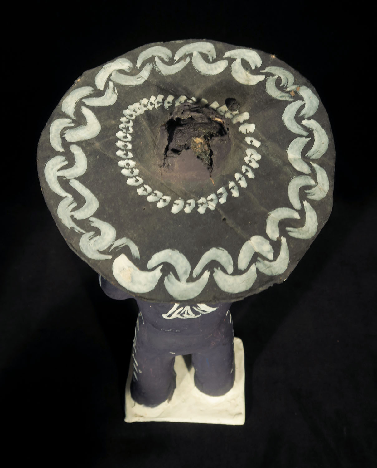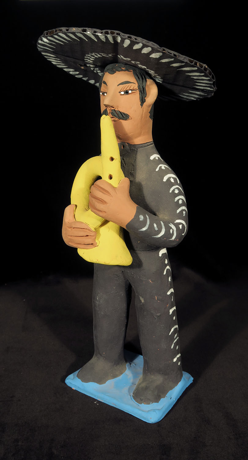 Set of four fired clay figures painted with acrylic paints. Removable sombreros made of corrugated cardboard, painted.