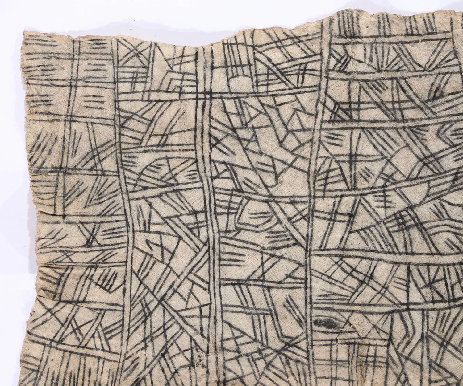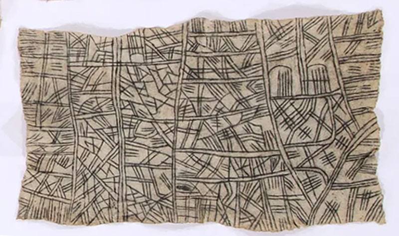 Hand-beaten tree-bark, painted with organic pigments (charcoal pigment with fruit juice fixative).